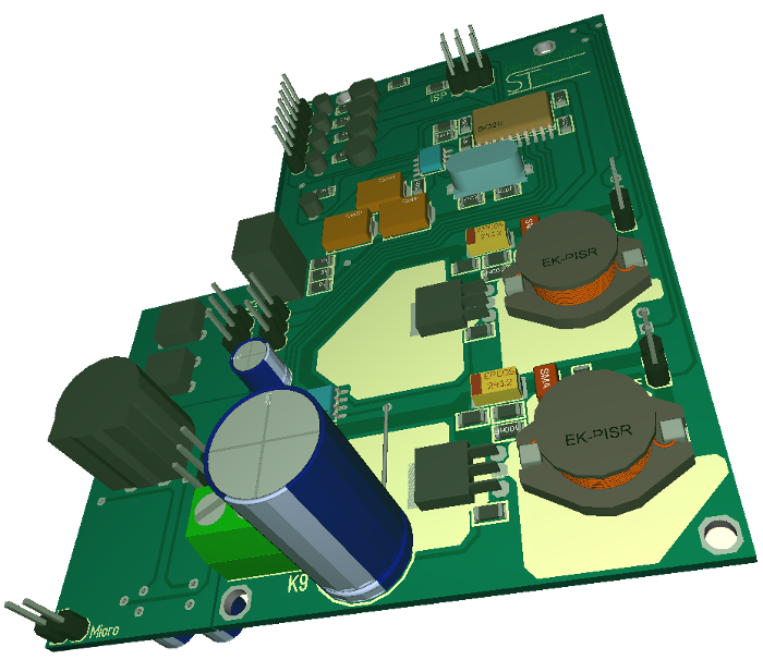 - Ausgänge mit P-MOS-Ventilen geschaltet (Tief-Setz-Steller/Buck-Topologie), Ansteuerung über AVR-PWM-Einheit, Ausgangsfilter zur Reduzierung der Flankensteilheit (fg~16kHz)