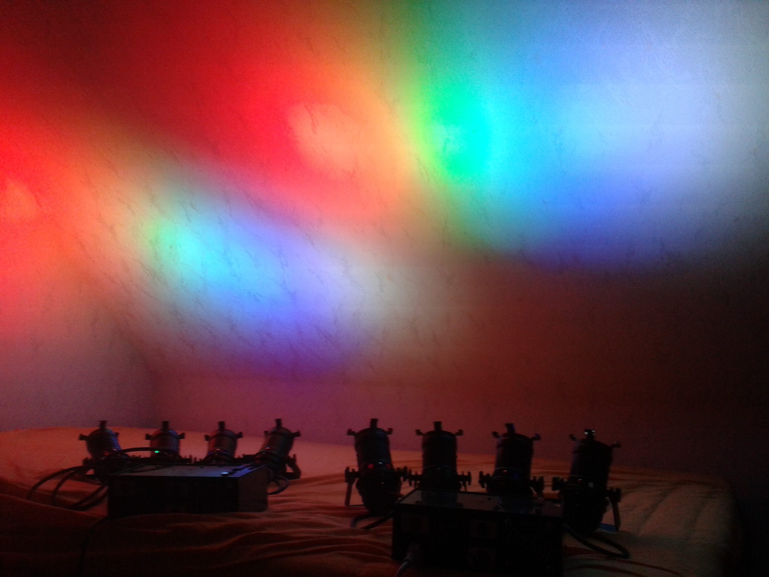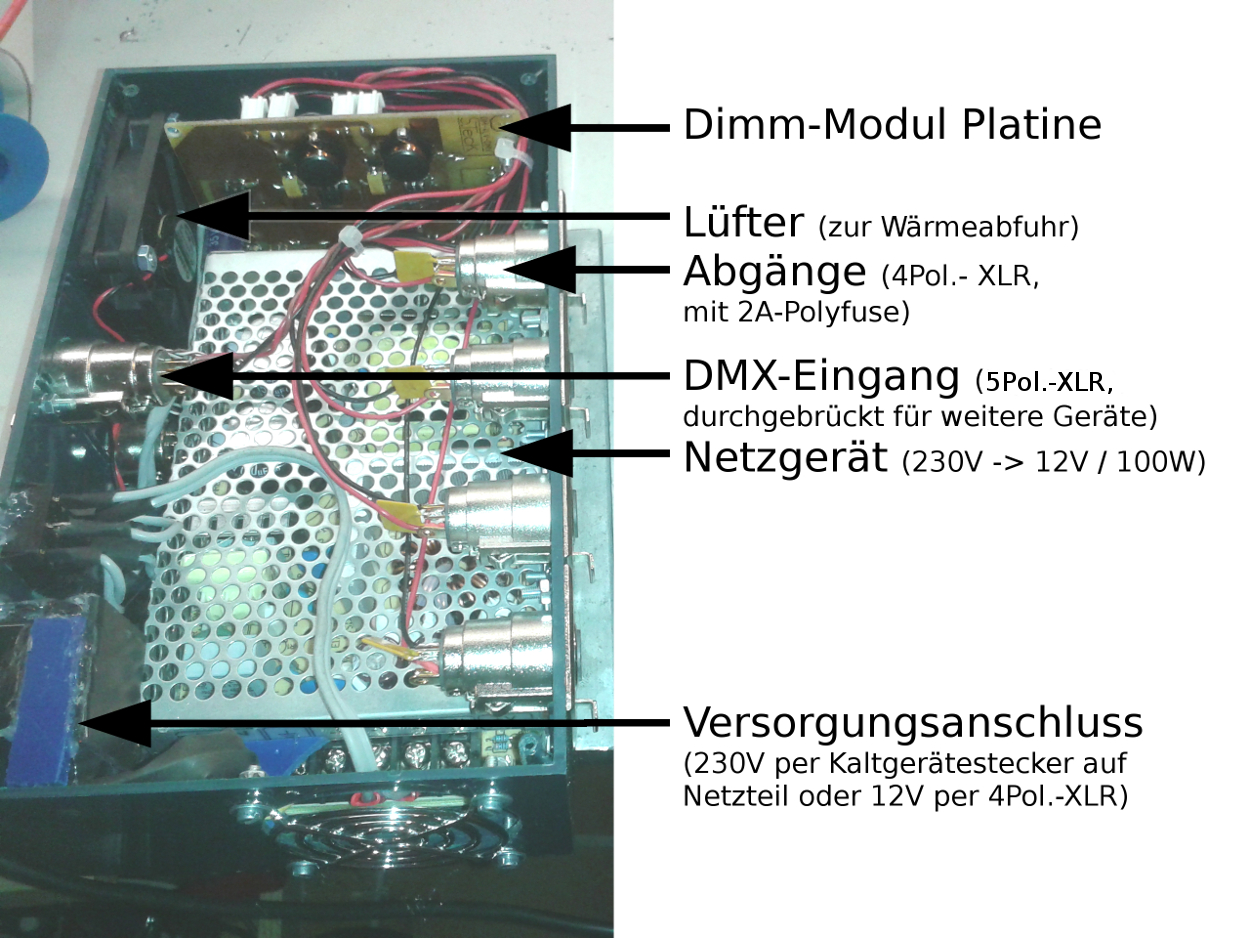 Ich habe die Platine für zwei Geräte aufgebaut und jeweils zusammen mit dem Netzteil in ein Gehäuse eingebaut. Ich betreibe an den Dimm-Modulen handelsübliche, dimmbare, farbige LED-Strahler (GU 5.3), die ich in PAR-16-Gehäuse gesteckt habe.