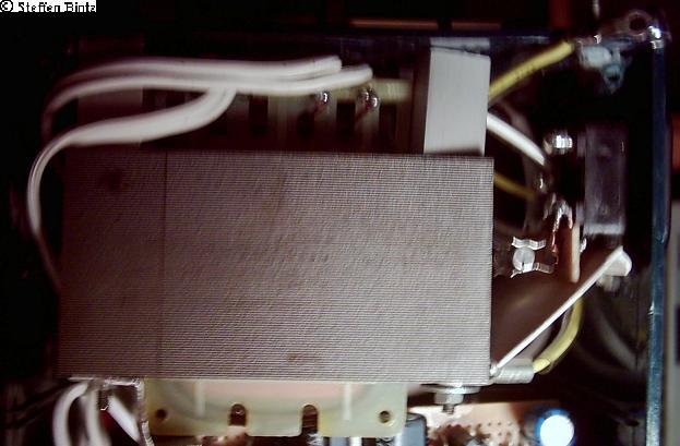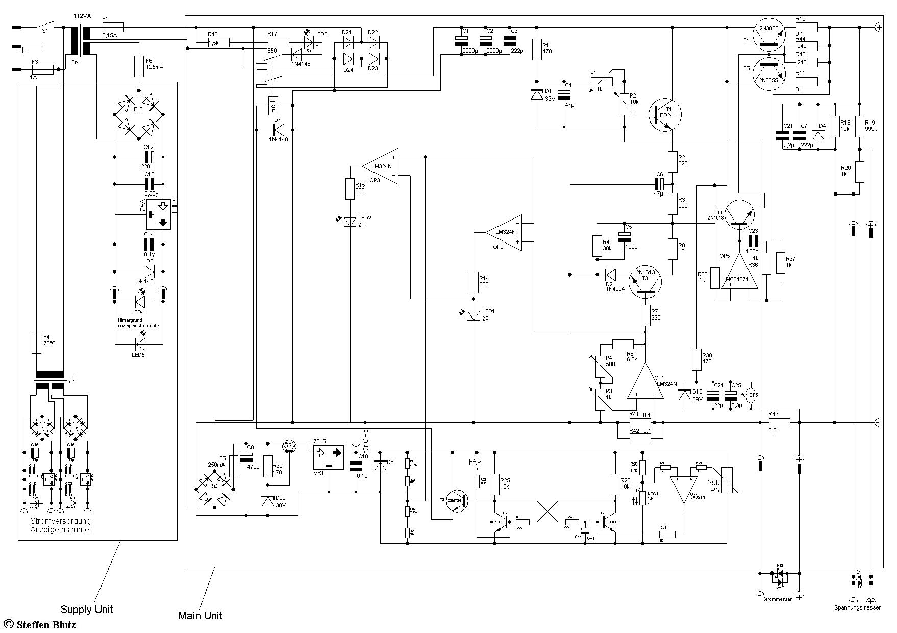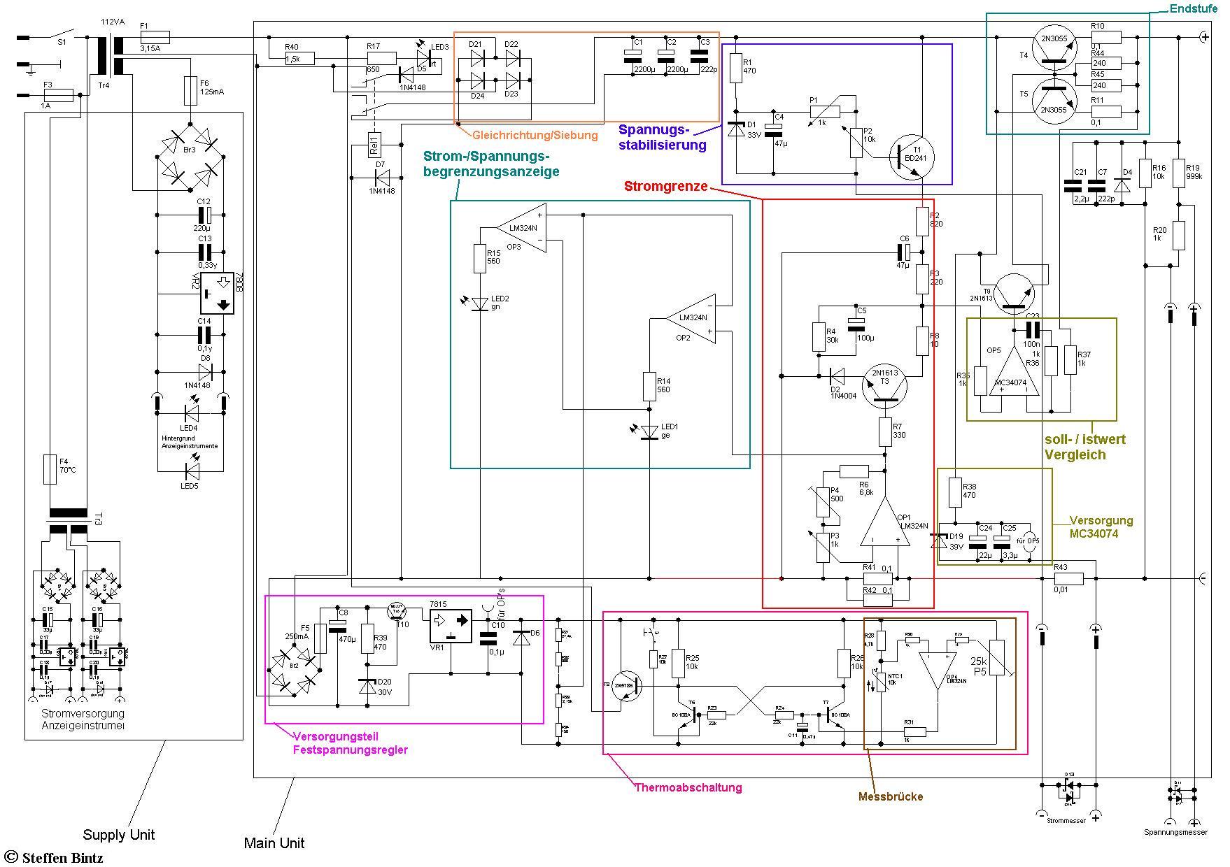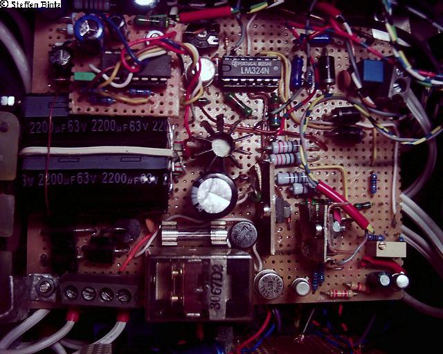 (was u.a. am mangelnden Verständnis der Schaltung meinerseits lag...). Jedenfalls hat mir dann jemand dazu geraten, Operationsverstärker (OP) einzusetzen, um die Funktion des Strombegrenzer zu optimieren. Nachdem ich mich in die Materie OP eingearbeitet hatte, gelang es mir auch einen regelbaren Strombegrenzer zu bauen. Für mein Netzgerät wollte ich digitale Anzeigeinstrumente verwenden (wegen der Optik und der besseren Ablesbarkeit). Nachdem ich zwei Stück gegrillt hatte und danach Spezielle besorgt hatte, die es dann auch verrissen' hat, habe ich mir erst mal einige Informationen über solche Anzeigen eingeholt. Mit extra Stromversorgung und Schottky-Dioden an den Messeingängen war dann auch dieses Problem gelöst. Die thermische Überlastabschaltung war das nächste Problem in der Reihe. Eine einfache bistabile Kippstufe sollte es werden. War aber nichts. Die Schaltung arbeitete aus irgendeinem Grund nicht zuverlässig. Dann kam ich auf die Idee eine Messbrücke mit Komparator zu verwenden. Das hat nach dem etwas mühsamen Abgleichen dann auch hervorragend funktioniert (und tut es immer noch :-). Nach der Materialbeschaffung aus den vorhandenen "Vorräten" und diversen Bestellungen wurde die Hauptplatine zusammengebaut (bereits zum zweiten Mal, da die Erste nichts war). -Testlauf-Zwei Feststellungen: 1. Der Trafo, den ich noch herumliegen hatte (Werte unbekannt) war doch zu schwach und2. Die Spannungsregelung war nicht stabil genug und schwankte zwischen 0 und Volllast um 1 bis 2 Volt. Neuer Trafo und immerhin schon Version V der Hauptplatine halfen auch diesen (zum Glück) letzten Problemen ab und das Netzteil arbeitet zuverlässig und so, wie ich es haben wollte (Herbst 2005!). Etwas zur verwendeten Technik ↑ Via Brückengleichrichter und Siebung wird die Wechselspannungs sekundärseitig des Transformators in Gleichspannung gewandelt. (Mein Gleichrichter ist leicht überdimensioniert.) Über eine Z-Diode und einem Poti als Spannungsteiler wird eine einstellbare, stabilisierte Gleichspannung erzeugt die dann durch einen Transistor stromverstärkt wird. Der Strombegrenzer ist prinzipiell der Gleiche wie der, den ich in der oben erwähnten GFS verwendet habe (Funktion: Der Strom wird über einen Shunt-Widerstand erfasst und bei Überschreiten des per Poti eingestellten Maximalstroms mit Hilfe einer OP-Schaltung damit die Referenzspannung für die Spannungsregelung reduziert. Etwas präziser: Die Referenzspannung für die Spannungsregelung wird reduziert, wenn T3-D2 leitend werden. Sobald also das mit OP1 verstärkte Signal des Stromsensors den T3-D2 in den leitenden Zustand überführt, beginnt die Reduktion der Referenzspannung und über den Spannungregler die Reduktion der Ausgangsspannung, was wiederum zu einer Reduktion des Stroms führt. Mit Hilfe des Potis P3 wird die Verstärkung des OP und damit die Eingreifschwelle des Strombegrenzers eingestellt) Um eine stabile Ausgangsspannung zu erhalten, wird die Referenzspannung (aus Stromgrenze/Spannungsstabilisierung) mit der Ist-Spannung am Ausgang verglichen und entsprechend nachgeführt. (Soll-Istwert-Vergleich und Endstufe) Mit dem Festspannungsregler wird die zur Versorgung des LM324 nötige Spannung erzeugt; der MC34074 des Soll-Istwert-Vergleichs hat eine eigene kleine Versorgung. Über den Festspannungsregler wird auch die Thermoabschaltung versorgt. Die Thermoabschaltung besteht aus einer bistabilen Kippstufe, bei der der Transistor T7, der zum Abschalten angesteuert werden muss, von einem Komparatorausgang geschaltet wird. Der Komparator wertet die Messbrücke aus, die einerseits über einen Spannungsteiler einen (Temperatur-Referenz-)Schwellwert hat und andererseits einen Spannungsteiler, dessen einer Widerstand ein NTC auf dem Kühlkörper der Endstufe ist. Die Supply Unit besteht aus einfachen Spannungsreglern und versorgt digitale Anzeigeinstrumente. Das Ergebnis ↑Im folgenden werden Daten und Bilder des fertige Netzgeräts gezeigt. Der gesamte und endgültige Schaltplan. Bilder der Platine und des Innenlebens![]() ![]() ![]() Bilder vom fertigen Gerät